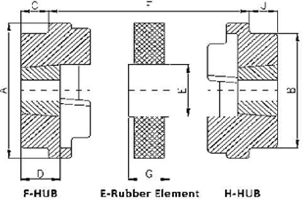 | Coupling Size | ERubber | F-Hub | H-Hub | Bush Size | Bore Size | A | B | C | D | E | F | G | J | Weight (Kgs) | Torque Nom (Nm) | Torque Max (Nm) | RPM Max | Axial | Misalignment Radial | Angular | Bore d | Inertia(gm^2) Bus hed |
